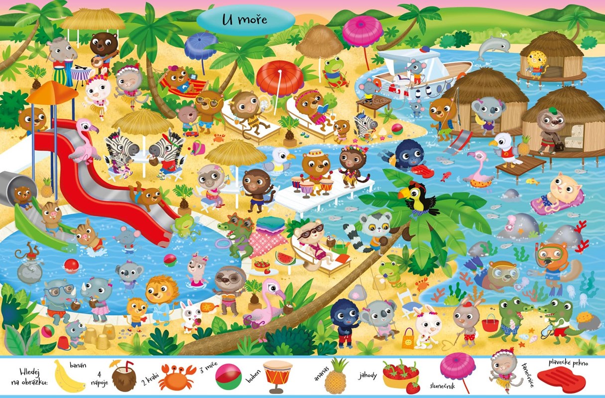 Zábavná kniha plná postav a předmětů, které je třeba hledat. Co se děje na horách, na sněhu, u moře, ve strašidelném domě, v zábavním parku, během kempování, v muzeu, v divadle a doma? Na konci knihy se nacházejí odpovědi hledaných předmětů. Knížka kromě 90 nálepek také obsahuje veselé obrázky pro vymalování.