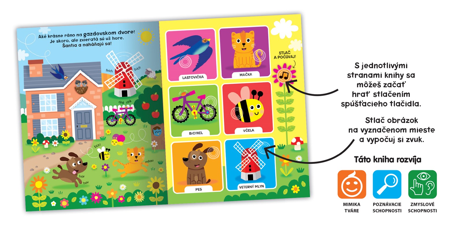 Táto farebná zvuková kniha predstavuje malým deťom život na farme. Deti sa zabavia pri spoznávaní obyvateľov farmy a pri počúvaní zábavných zvukov - všetko, čo potrebujú urobiť, aby ich počuli, je stlačiť obrázky!