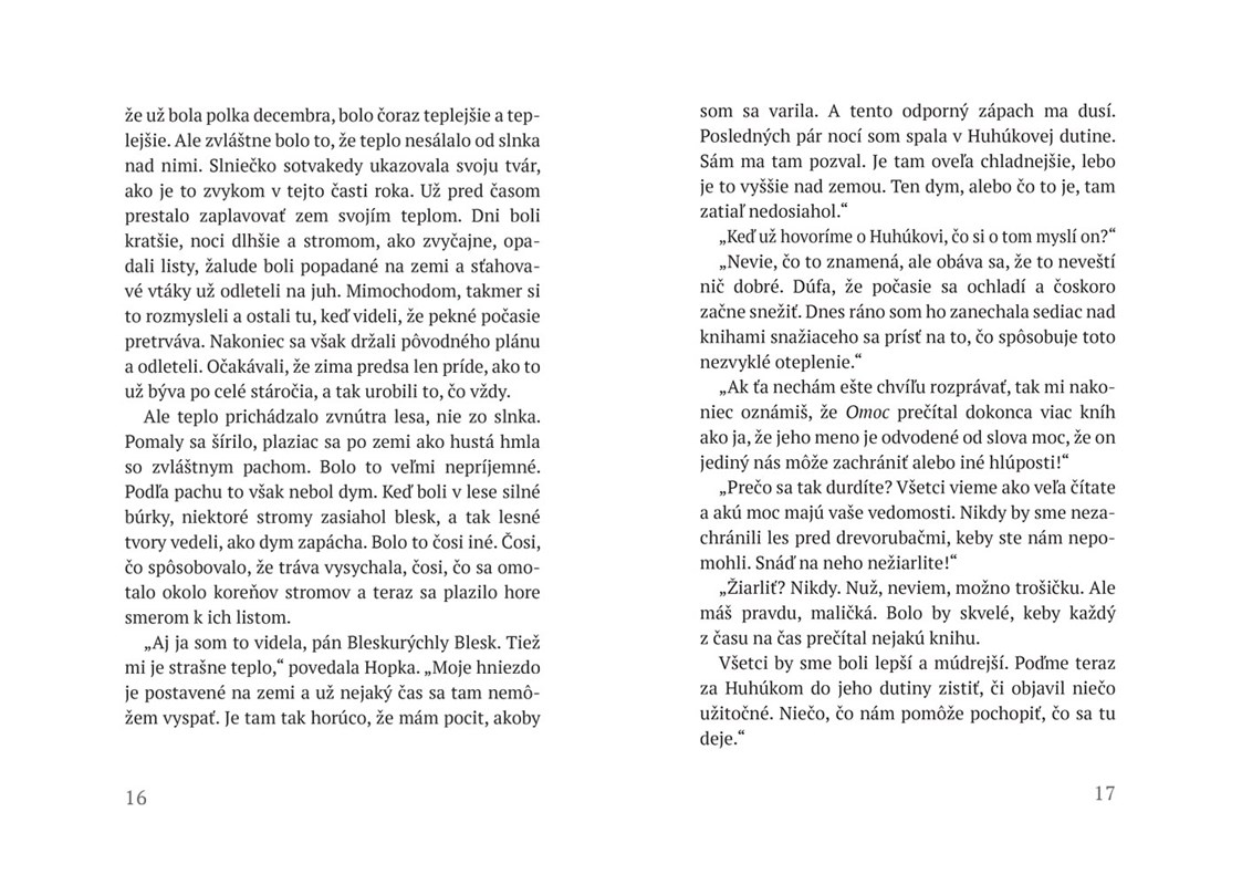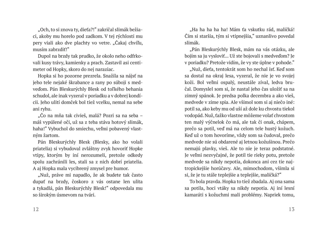 Zázrak padajúcich snehových vločiek je príbeh o bystrom mláďati škovránka, rýchlom slimákovi s ulitou plnou kníh a sove-vegetariánke. Spolu zachránia les a postarajú sa o to, aby do lesa opäť zavítala zima. Za týmto nádherným príbehom o zázraku, napísanom podmanivým jazykom a zručne ilustrovanom, sa skrýva nesmierne dôležité ponaučenie o skutočnom priateľstve a tolerancii. Hopka deti naučí, že vzhľad je často klamlivý a že je dôležité starať sa o životné prostredie.
