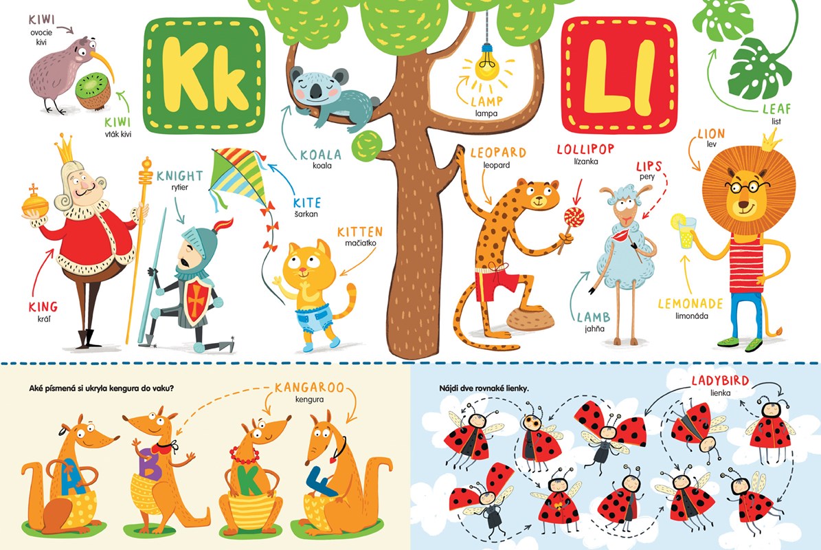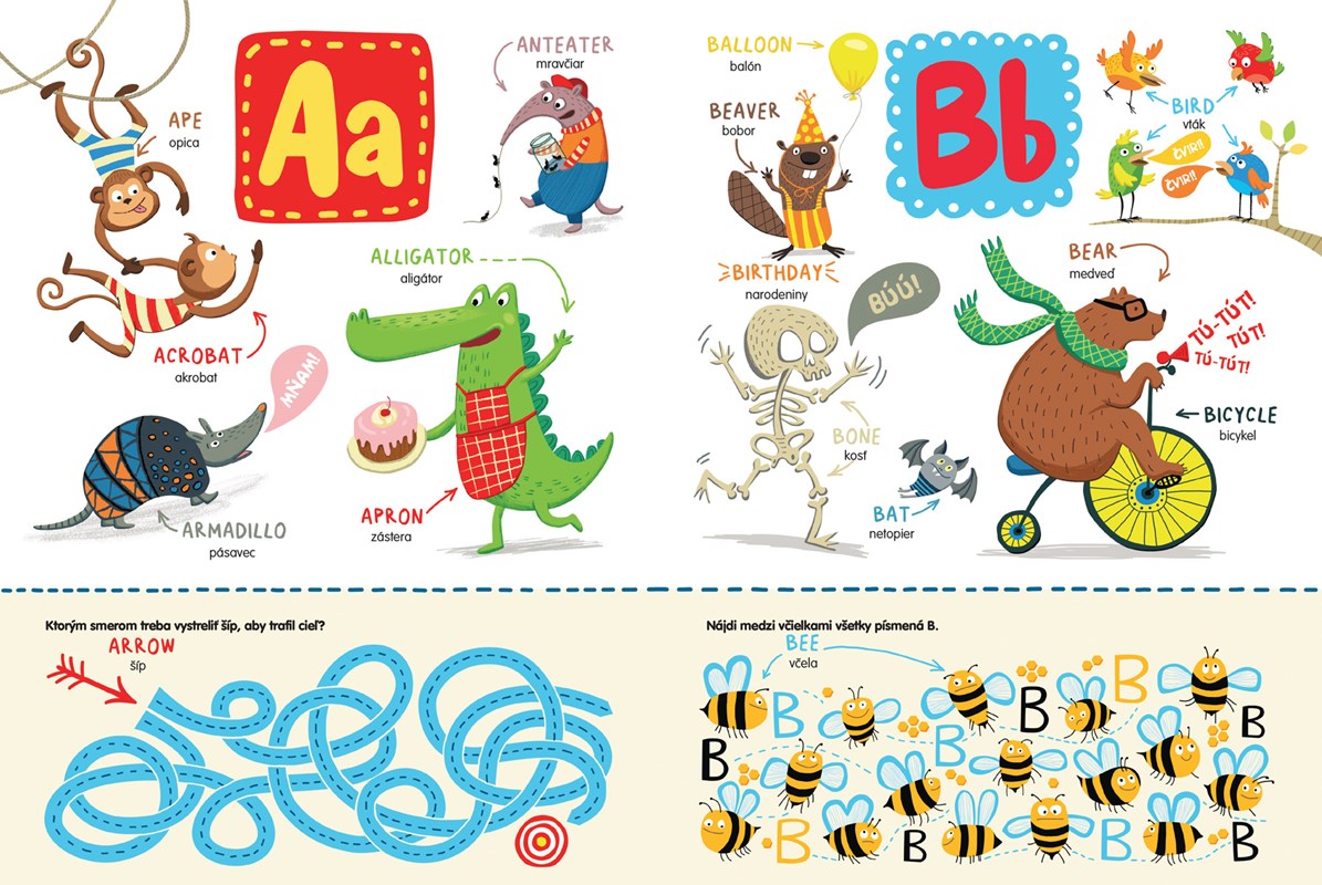 Chcete naučiť vašich drobcov po anglicky hravou formou? Prvý krok do sveta angličtiny predsa začína písmenami! Na ceste spoznávania písmen anglickej abecedy na deti čaká žabka, aby jej pomohli dostať sa na breh, kengura s ukrytými písmenkami vo vaku, kobylky s klobúkmi, korčuľujúci sa los, nezbedné včielky a mnohé iné zvieratká, s ktorými sa naučia základné slovíčka s úsmevom.