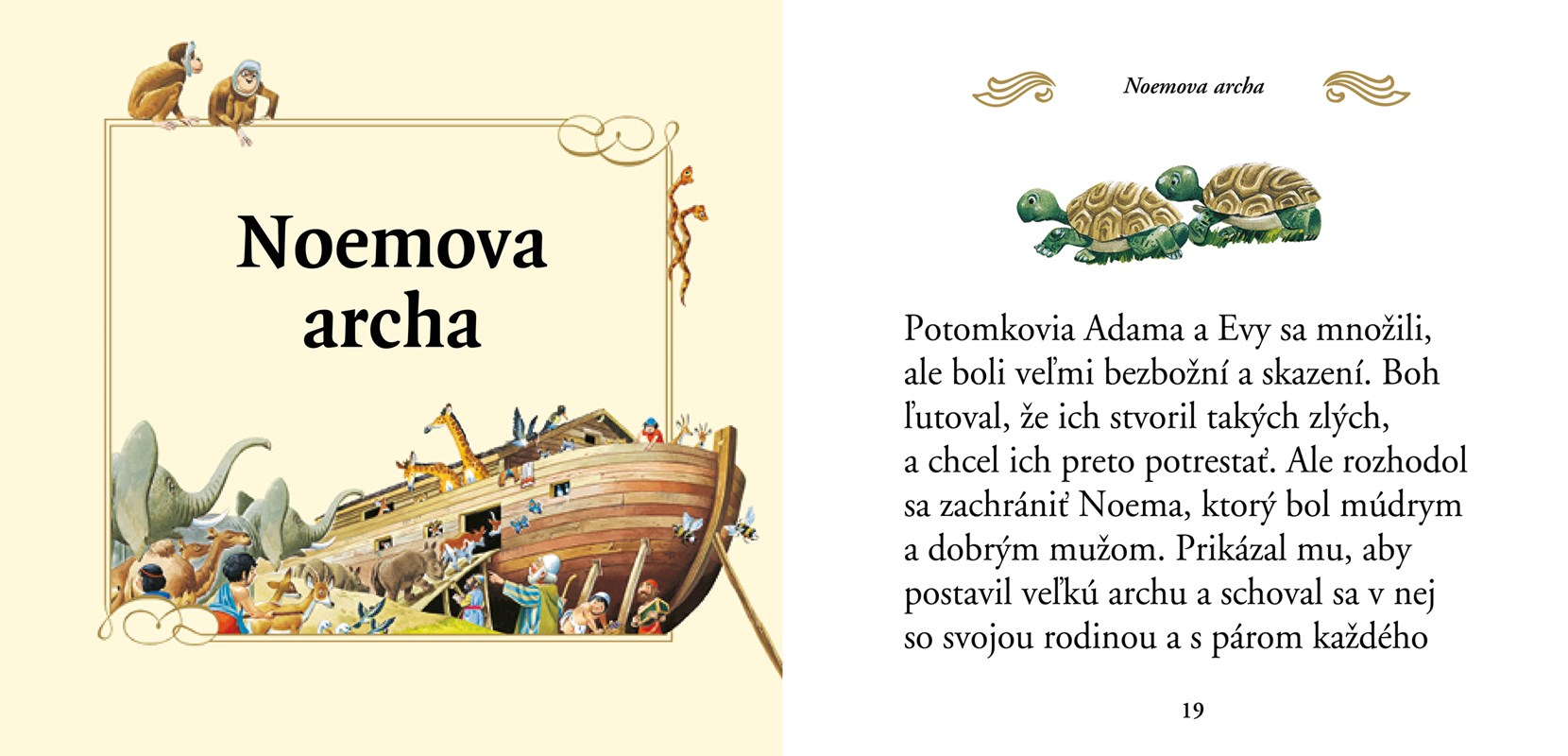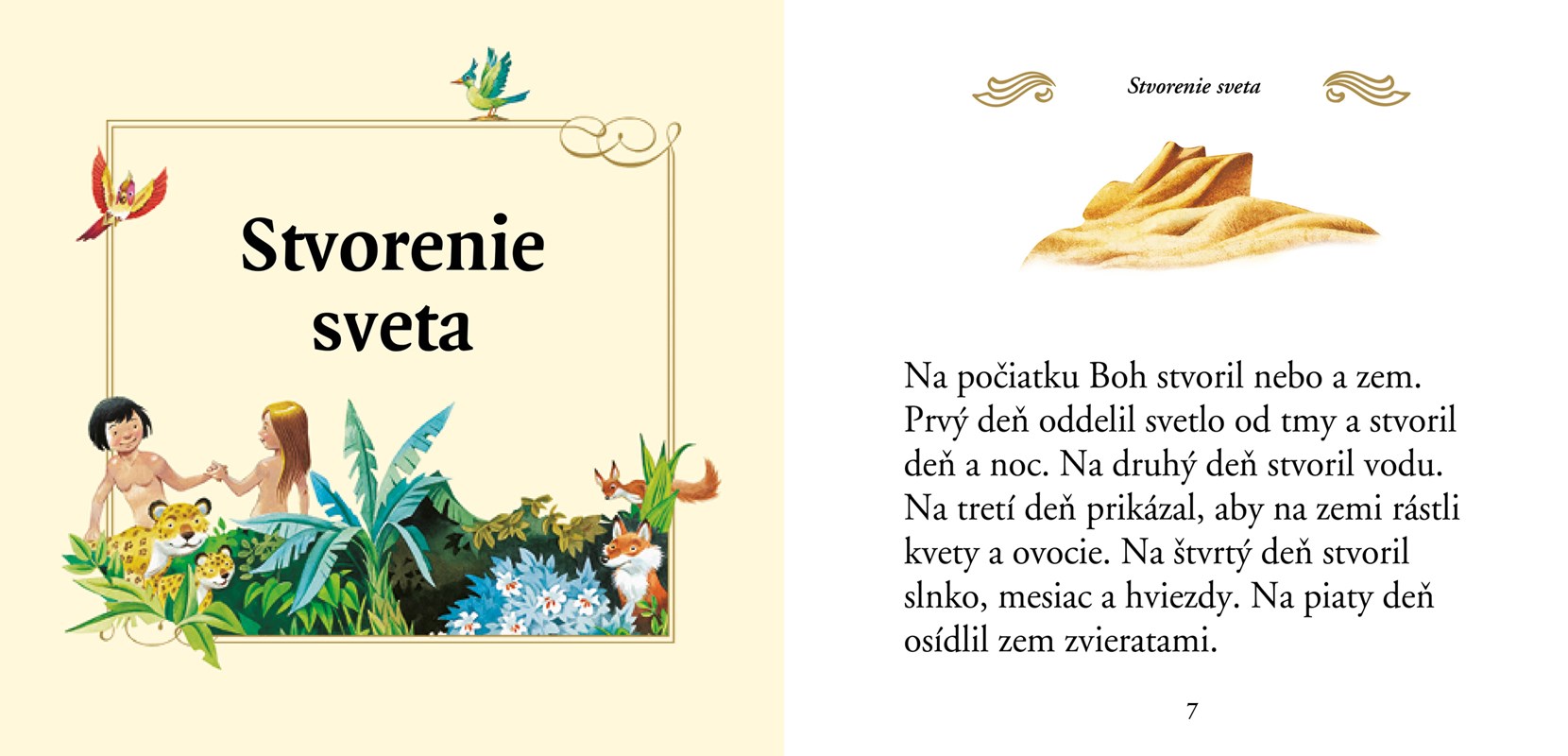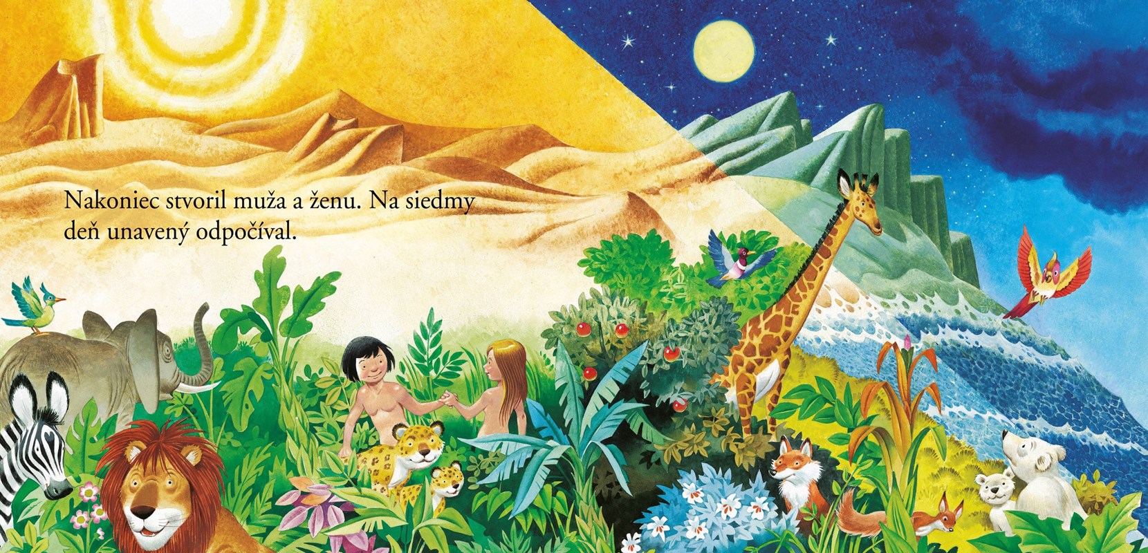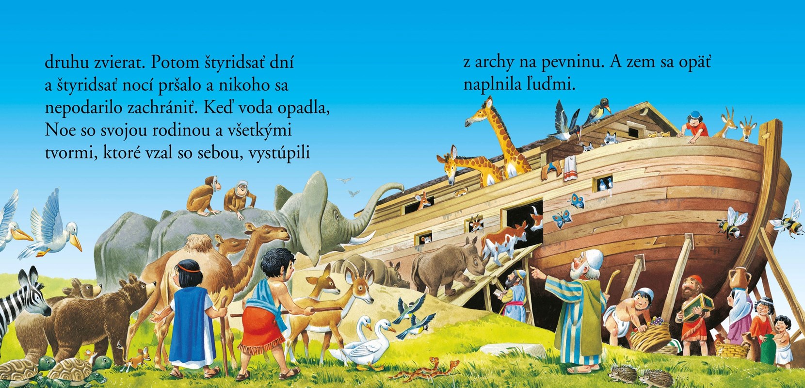 Detská Biblia prináša najmenším zvedavým deťom štrnásť najfascinujúcejších príbehov zo Starého zákona ilustrovaných Tonym Wolfom (Stvorenie sveta, Adam a Eva, Kain a Ábel, Noemova archa, Babylonská veža, Abrahám a Izák, Ezau a Jakub, Jozef a jeho bratia, Faraónove sny, Mojžiš, Útek z Egypta, Prechod cez Červené more, Desatoro prikázaní, Prechod cez Jordán). Knižka učí deti o základných pilieroch ich viery už od útleho veku.