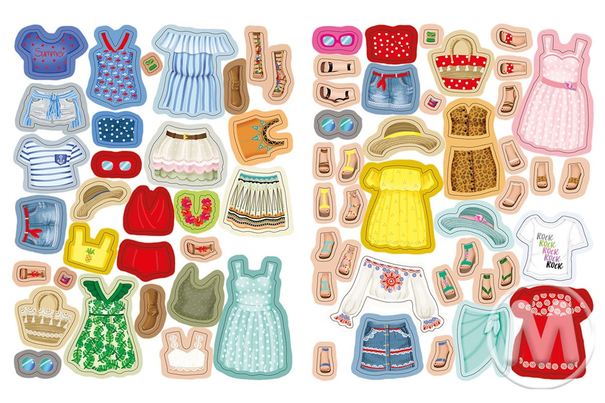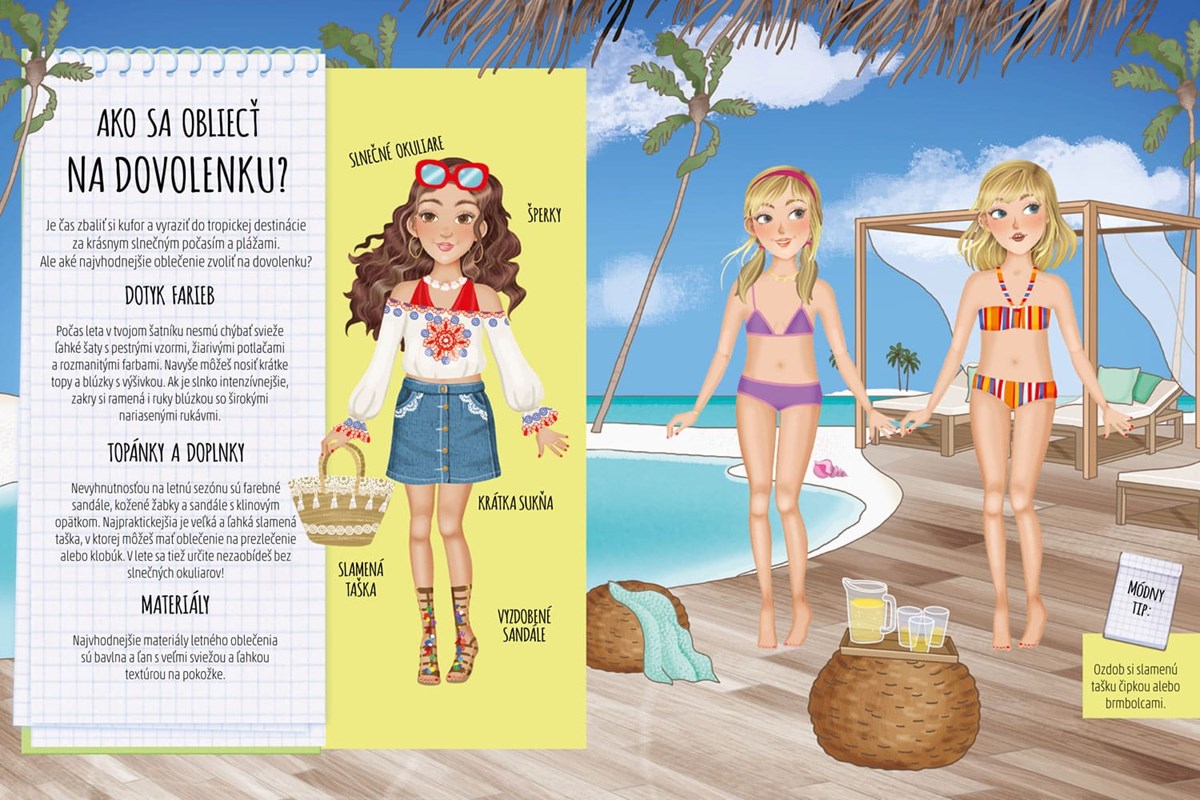 Je čas zbaliť si kufor a vyraziť do tropickej destinácie za krásnym slnečným počasím a plážami. Ale aké najvhodnejšie oblečenie zvoliť na dovolenku? Navrhni originálny outfit a zažiar ako módna návrhárka! Použi až 100 opakovane použiteľných nálepiek na vytvorenie množstva jedinečných módnych oblečení. Nauč sa názvy látok, odevov a doplnkov na rôzne príležitosti. Zaži veľa zábavy vytváraním módnych kúskov!