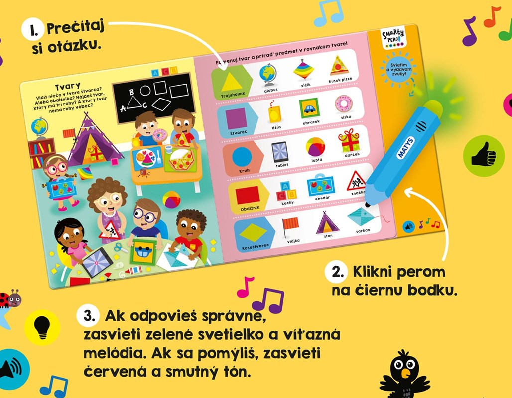 Chceš vedieť všetko? V tejto interaktívnej knihe sa dozvieš veľa fascinujúcich vecí o farbách, tvaroch, protikladoch, povolaniach a oveľa viac. Smarty pero ti pomôže ľahko otestovať svoje znalosti o nich. Ako na to?