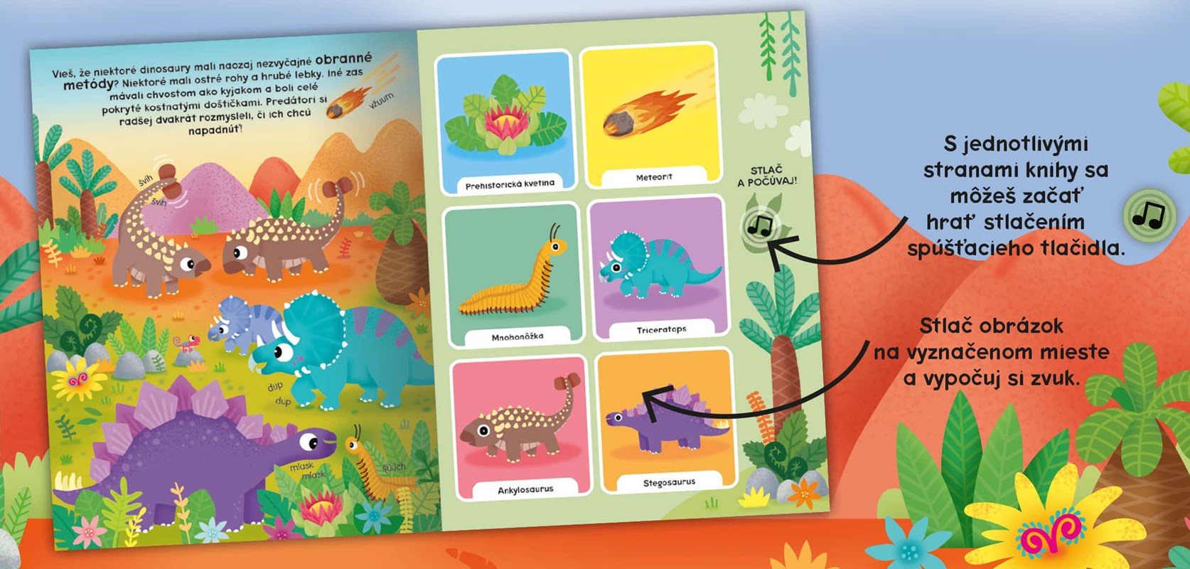 Táto farebná zvuková kniha je skvelým predstavením prehistorického sveta! Zabavte sa pri spoznávaní mien dinosaurov a ťuknutím na obrázky si vypočujte, aké zvuky vydávali.