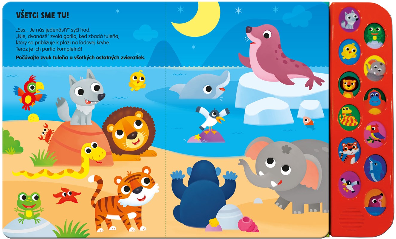 Poď so zvieratkami na výlet! V tejto zábavnej zvukovej knižke ťa čakajú vlk, žabka, vtáčik, slon, lev, gorila, had, papagáj, tiger, delfín, čajka a tuleň. Vďaka veselým obrázkom a jednoduchým textom si deti hravou formou rozvíjajú pozornosť, sluch aj slovnú zásobu. Zisti, kde zvieratká žijú, a hádaj, aký zvuk vydávajú! Knižka je navrhnutá tak, aby podporovala pozorovacie schopnosti a sluchové vnímanie detí, čím sa stáva zábavným a vzdelávacím nástrojom pre najmenších. Je ideálnym spoločníkom pre deti od 3 rokov, ktoré sa chcú naučiť viac o zvieratkách a ich zvukoch. Objavovanie ešte nikdy nebolo také zábavné!