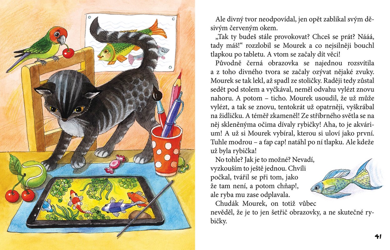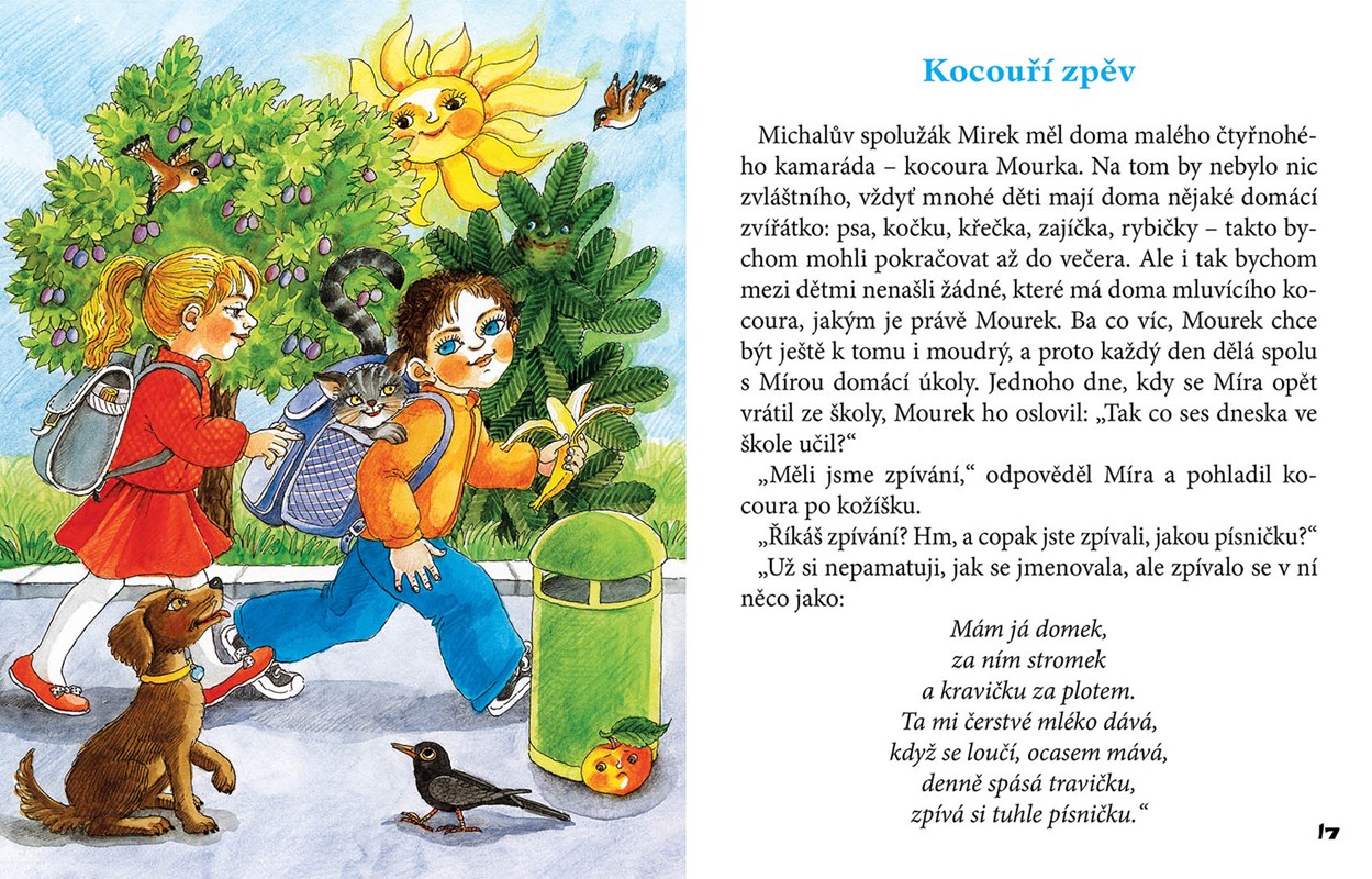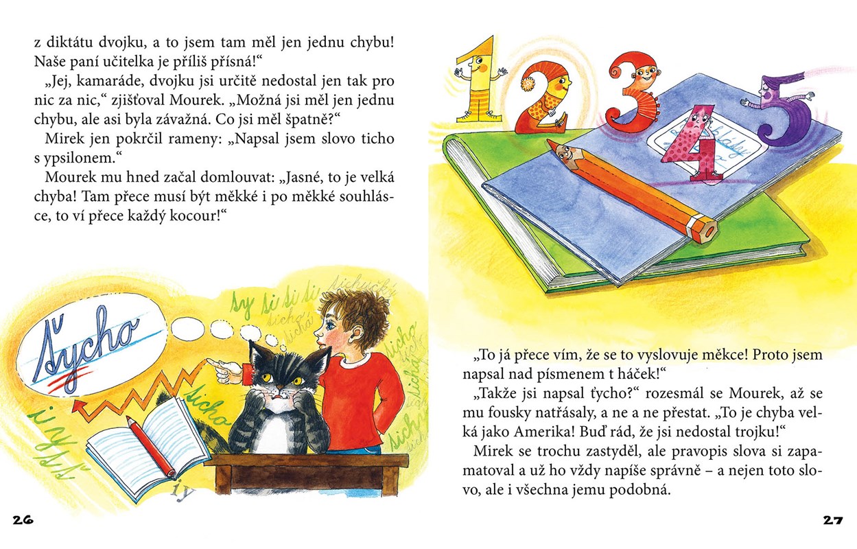 Kniha Mirek a Mourek je čtení pro velmi malé děti, nejlépe pro prvňáčky. Příběhy jsou většinou ze školy, do které občas vezme Mirek svého kocourka Mourka. Ten ale svým mňoukáním ruší děti i paní učitelku třeba při hodině zpěvu. Dozvíte se ale také, jak školník zaspal do školy, jak psal Mirek svůj první diktát a jak se Mirek a Mourek učili anglicky. Všechny příběhy ale nejsou jen o Mirkovi a Mourkovi, najdete zde i povídání o ztraceném mravenečkovi, hodném krokodýlovi nebo o Julince, která nechtěla snídat. Tato bohatě ilustrovaná kniha je doplněna básničkami a veršovanými hádankami.